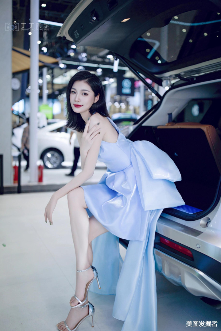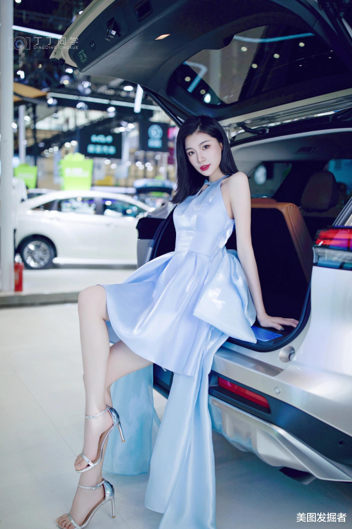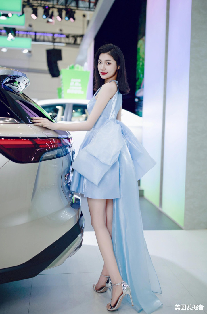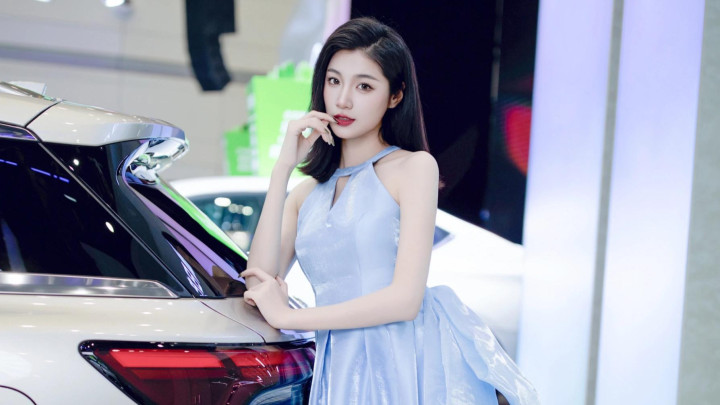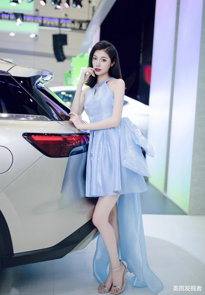 浅蓝绸缎礼服勾勒出曼妙曲线, 车展精灵, 优雅天鹅颈的灵动之美